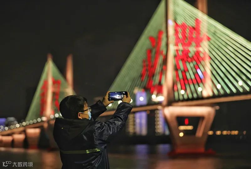2月28日,武汉长江二桥打出“武汉必胜”字样。灯光维修师温瑞在雨夜中拍照记录。新华社发