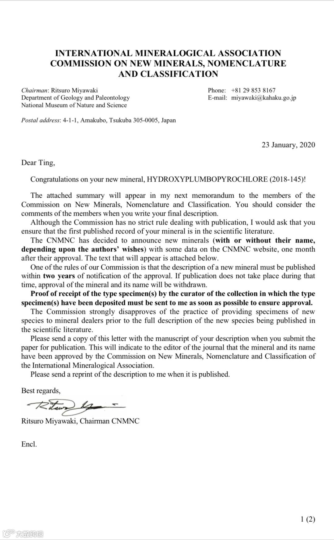 CNMNC主席签发的羟铅烧绿石通过的文件
