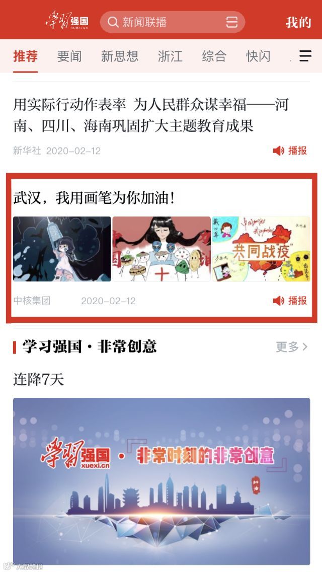 2月12日,秦山核电职工子女绘画作品《武汉,我用画笔为你加油!》在“学习强国”平台首页发布。