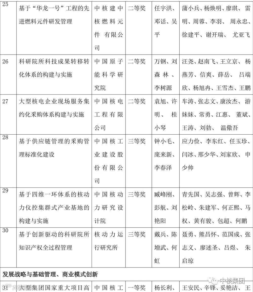 核动力院《基于基因型模型的文化牵引式核动力品牌“双链”管理体系的构建与实施》、中核山东能源《新能源项目收并购标准化管理》、江苏核电《核能发电企业基于产能提升的输电线路增容管理》等20项成果获三等奖。(详见下表)