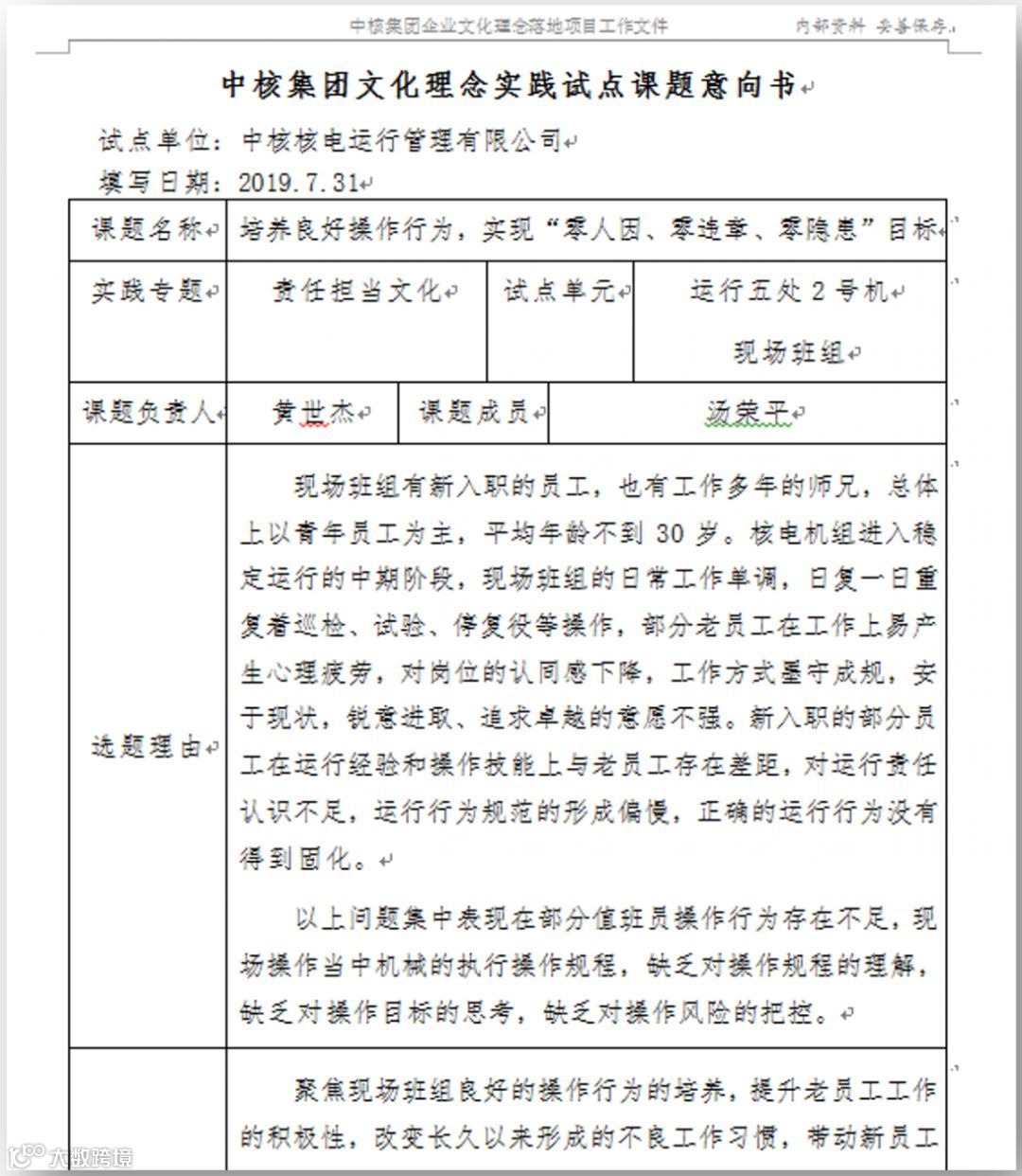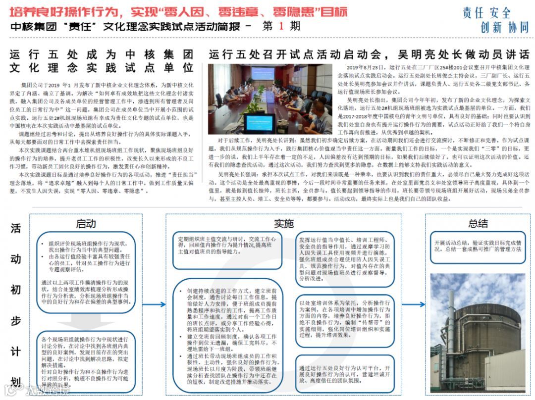 背景链接:为培育一流文化,锤炼过硬作风, 2019年7月,中核集团专题印发方案,推进以企业文化落地深化作风转变工作,旨在通过建立机制和开展一系列工作,推动实现集团公司在新时代的新使命新战略。其中一项重点任务是开展企业文化理念落地试点工作,秦山核电运行五处2号机组现场班组作为中国核电推荐的四个试点单元之一,以“厚植成效导向的责任文化”为专题,从2019年7月开始开展为期5个月的试点工作。运行五处2号机组现场班组确定“培养良好操作行为,实现‘零人因、零违章、零隐患’目标方向”课题,通过开展现场班组操作行为现状评价分析并制定改进方向、建立持续改进机制和班前会制度、开展良好操作行为认可、建立定期简报宣传机制等方式,聚焦现场班组良好的操作行为的培养,提升老员工工作的积极性,改变长久以来形成的不良工作习惯,带动新员工固化良好的操作行为,激发全员责任心和创新精神。