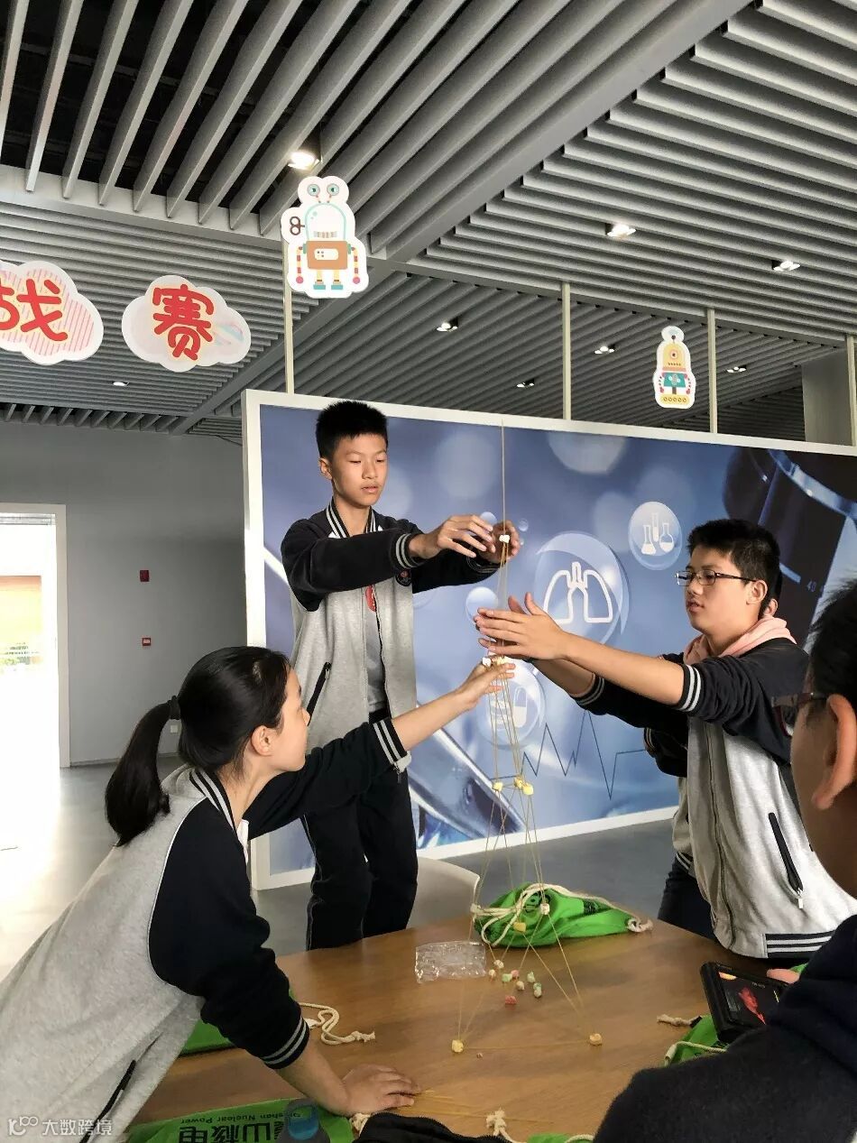 实践之旅在核电科技馆临展区进行。同学们拿着手上的意大利面、棉花糖一阵端详,脑袋里闪过无数疑问。原来,这是要用意大利面和棉花糖做道具,搭建一座即牢固又“高耸入云”的建筑物。这看起来简单,动起手来还真费劲呢!同学们六个人一组,有的插棉花糖,有的用手扶住底座,还有的负责“刺探军情”,原来组与组之间还有比拼呢!