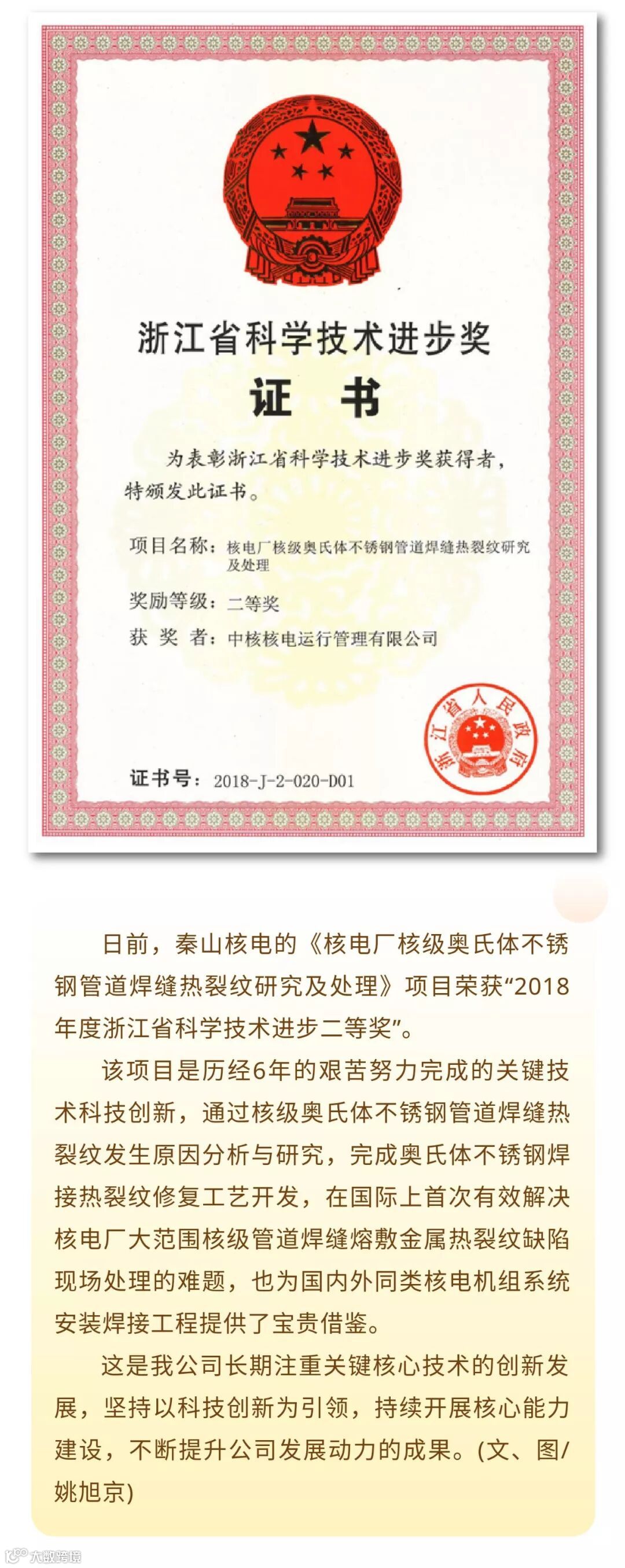 喜讯∣秦山核电获得2018年度浙江省科学技术进步二等奖