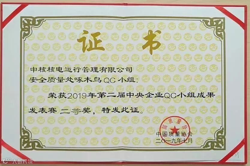7月16日至18日,由国务院国资委指导、中国质量协会主办的第二届中央企业QC小组成果发表赛在北京举办,秦山核电安全质量处啄木鸟QC小组成果荣获“二等奖”。