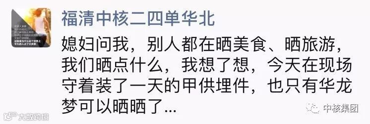 妻子在刷朋友圈时问他“别人都在晒美食、晒旅游,我们晒点什么呢?”单队长微微一笑:“我们可以晒一晒‘华龙梦’呀”。“你们核电人真不懂浪漫,就知道工作,一根筋!”