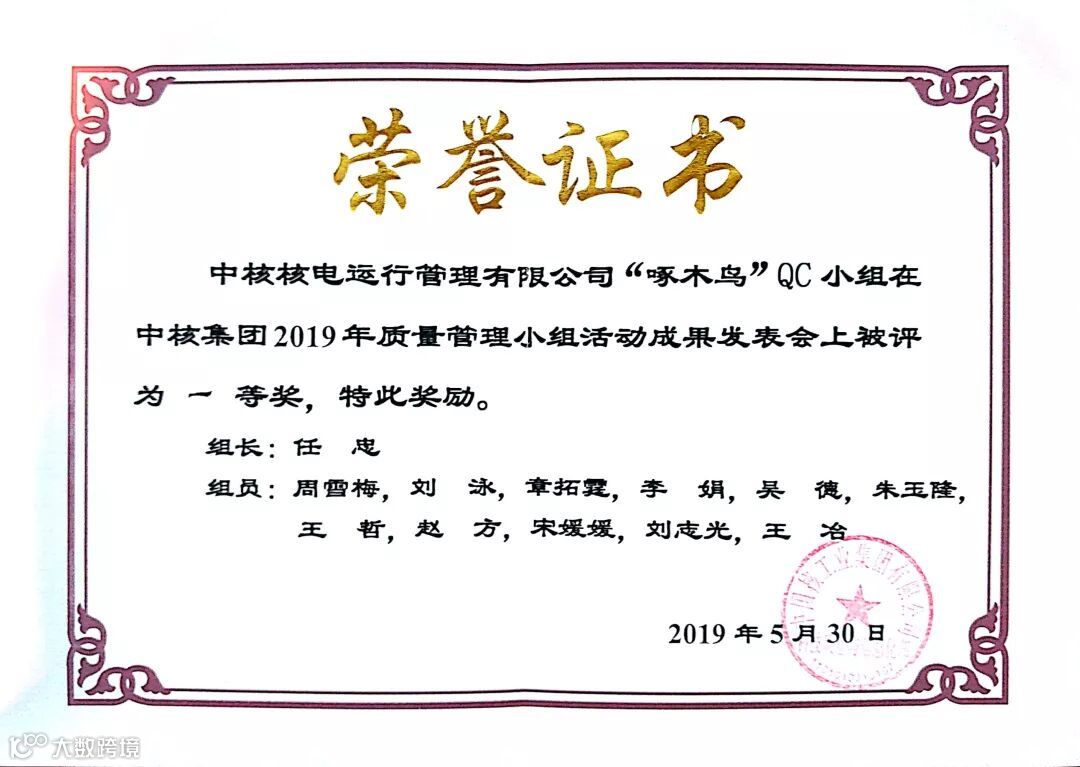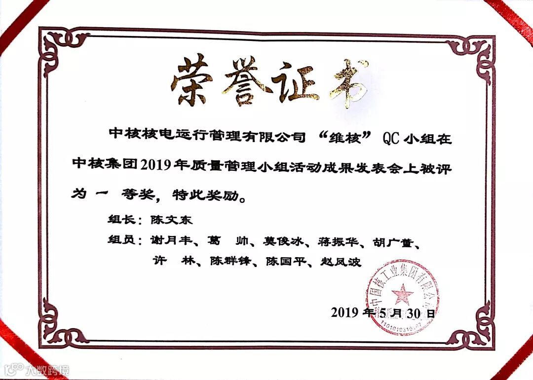 5月31日,秦山核电在中核集团2019年QC小组活动成果发表会上收获佳绩,维修三处“维核”QC小组、安全质量处“啄木鸟”QC小组均获得一等奖。其中,“维核”QC小组还被中核集团推荐申报为“全国优秀QC小组”。