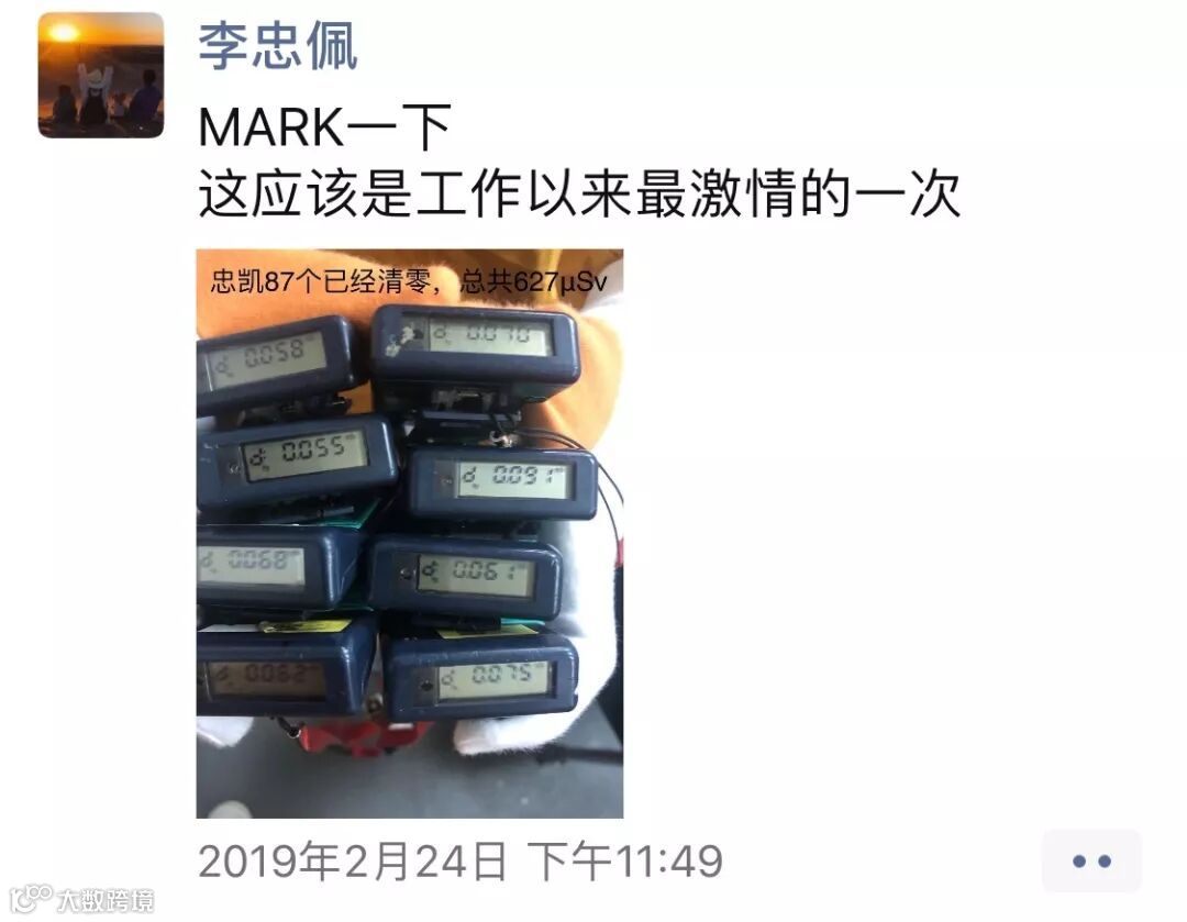 当上滑到昨天23时49分的一条朋友圈时,郝翀的眼睛顿时一亮:他可是很少发朋友圈的啊,点赞的还不少呢。但打开图片,她的眼神又顿时复杂起来。白色的手套紧握着八个电子剂量计,定格的数字宣示着中班反应堆厂房内巨大的工作量。