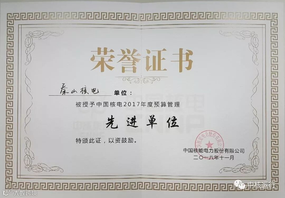 近日,中国核电对各成员单位2017年度会计信息披露质量和预算管理工作进行了总结评价,授予公司“2017年度会计信息质量管理先进单位”、“2017年度预算管理先进单位”二项荣誉称号。