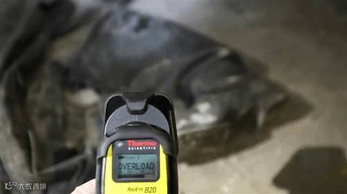 而当小哥靠近当年消防员的衣物时,盖格计数器的鸣叫声由急促变成了长鸣,数字也从1500微西弗每小时直线上升至“Overland!”爆表了!此时摄影机也开始受到干扰,小哥说话的声音也变的含糊不清,太可怕了!