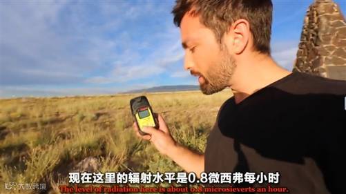 这里是世界上第一颗原子弹进行爆炸试验的场所,在爆炸中心,小哥发现了爆炸瞬间高温形成的玻璃化沙子。检测发现,这里的辐射剂量为0.8微西弗每小时。而玻璃化沙子的辐射剂量甚至达到了3微西弗每小时!