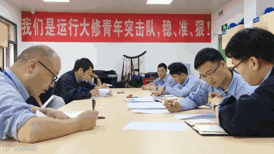 8:30分,114大修青年突击队A组成员准时召开接班会。党支部书记倪明强每天总是提早来到厂区,熟悉机组状态,准备会议材料。