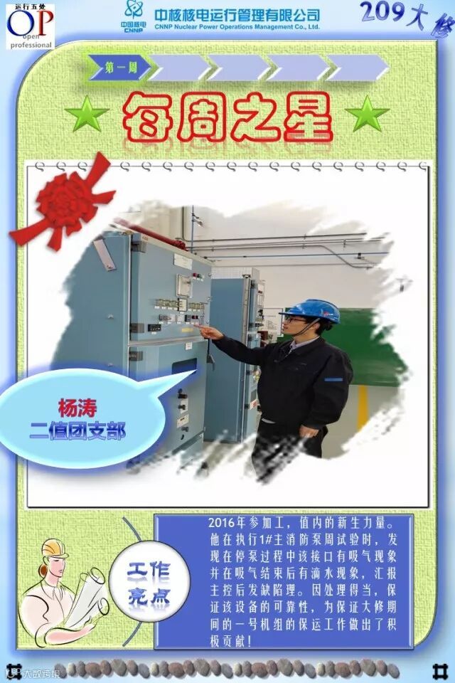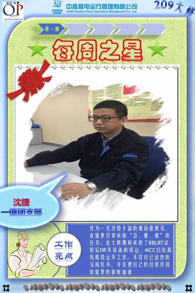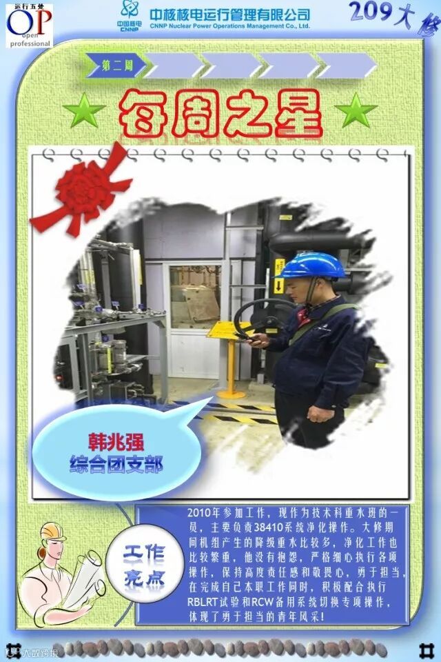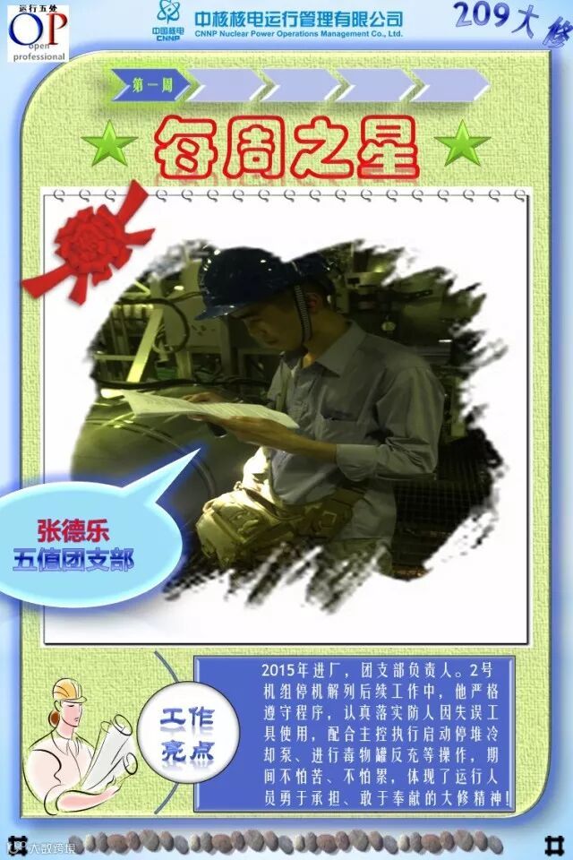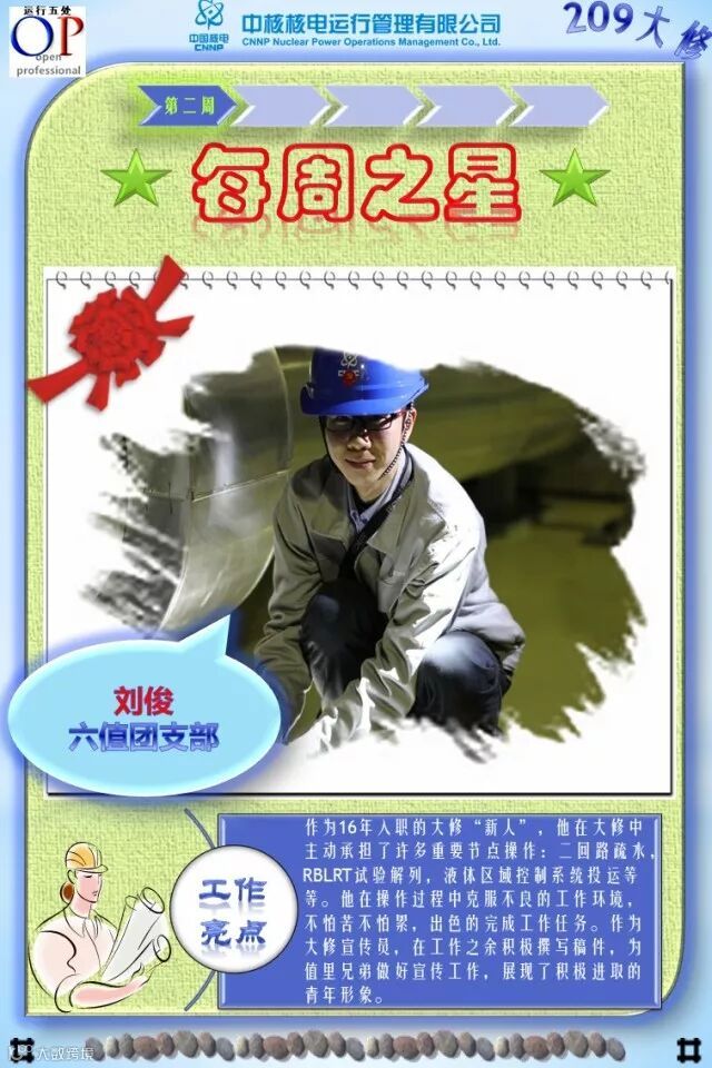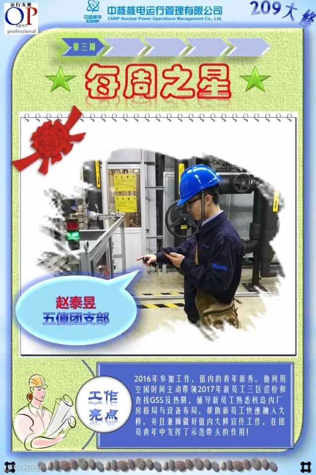 OT209大修已进行了3个多星期,大修的各项工作在稳步有序推进,各支部团员青年在大修中勇于担当、积极主动工作,尤其在险、重、急、难等工作勇挑重担,发扬了不怕苦、不拍累的忘我工作精神,为大修各项工作的顺利开展做出了积极的贡献,充分发挥了主力军和生力军的作用,展示了当代青年的担当与责任!特别是被评选为“每周之星”的团员青年,他们的亮点工作及感人事迹深深感动与鼓舞着我们身边的每一个人,我们为之点赞,并向他们学习!