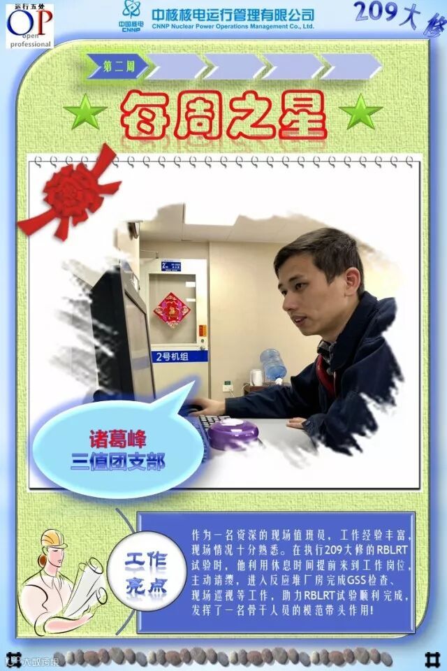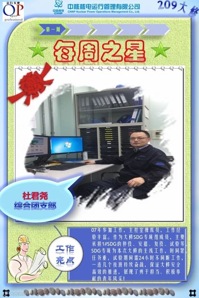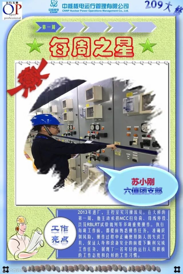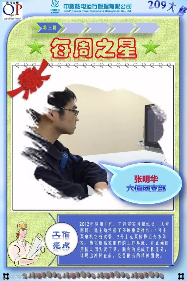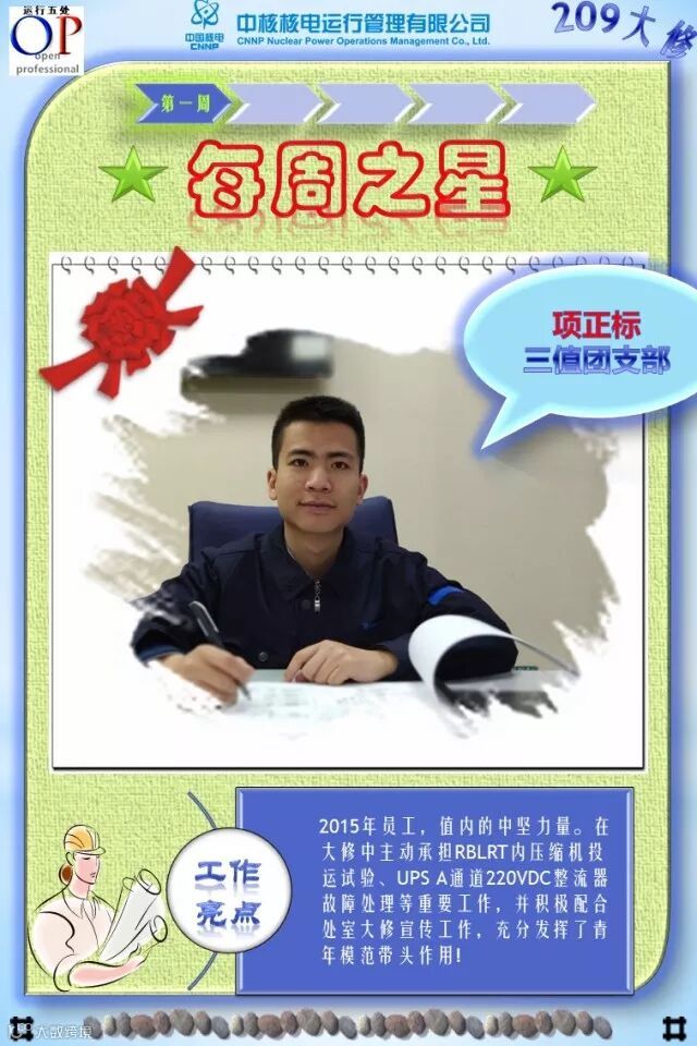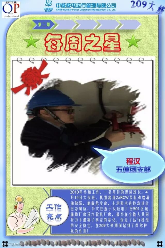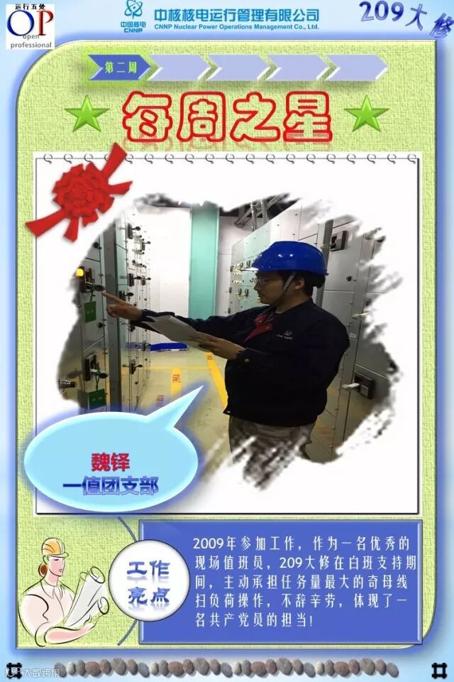 OT209大修已进行了3个多星期,大修的各项工作在稳步有序推进,各支部团员青年在大修中勇于担当、积极主动工作,尤其在险、重、急、难等工作勇挑重担,发扬了不怕苦、不拍累的忘我工作精神,为大修各项工作的顺利开展做出了积极的贡献,充分发挥了主力军和生力军的作用,展示了当代青年的担当与责任!特别是被评选为“每周之星”的团员青年,他们的亮点工作及感人事迹深深感动与鼓舞着我们身边的每一个人,我们为之点赞,并向他们学习!