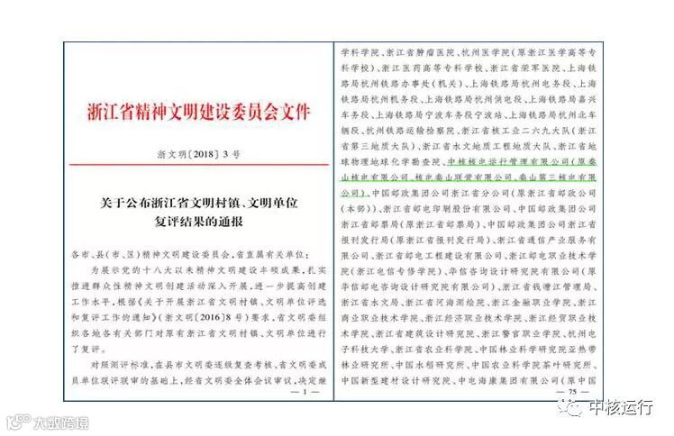 近日,从浙江省文明办传来好消息,公司通过浙江省文明单位复评,并且申报主体从原秦山核电有限公司、核电秦山联营有限公司、秦山第三核电有限公司三家业主单位正式变更为中核核电运行管理有限公司。今后,秦山核电基地将以中核运行为主体,开展精神文明创建工作和全国文明单位争创工作。