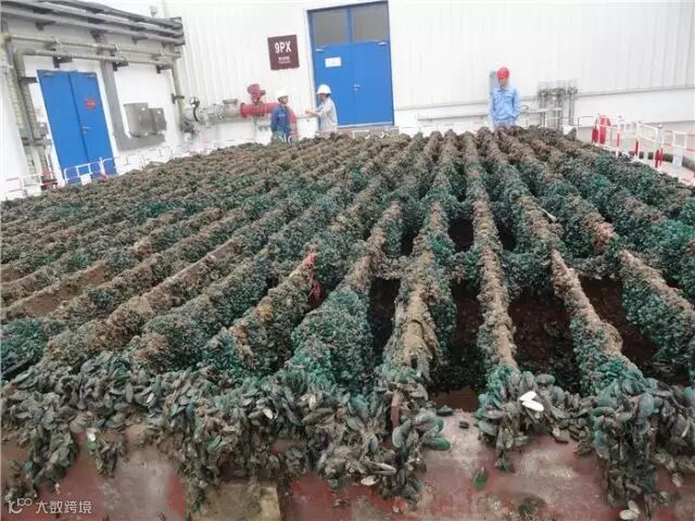 粗格栅,实际上就是一块铁栅栏,相当于核电站入水口的过滤器。在海水流入过程中,各类较大型动植物在外围已经被过滤了,而细小的海草植物和贝类等却依然“溜”了进来,它们像小石子一样“黏满”粗格栅表面,远远看去粗格栅更像一台海产品养殖箱。如果你去过海边,想必会在海边的桥墩下、岸堤旁见过贝壳密密麻麻聚集的场面。
