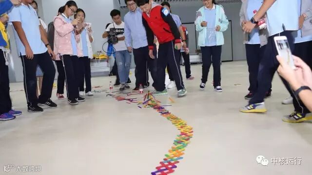 “噼里啪啦、噼里啪啦……”,这是哪里的声音?是在放鞭炮欢迎同学们的到来吗?原来,这是从多米诺创意搭建传出来的声音,只见同学们小心翼翼地搭设完多米诺后,拆掉第一支塑料棒,多米诺散开发出的连锁反应,让同学们不禁欢呼雀跃起来。“这也是链式反应的一种哦,和核电反应的原理相似”,带队的科学老师在一旁向大家介绍道。