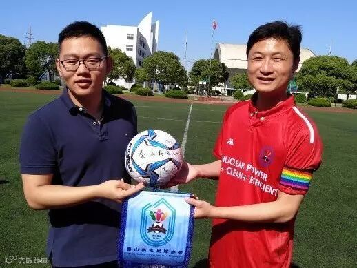 比赛开始前,公司足协向对方赠送了精心准备的秦山核电足球队队旗和签名足球。