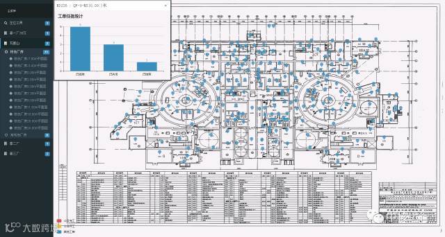 工单地图中的所有工单数据来自于N1-EAM系统,在电厂生产过程中,新的工单不断地生成,现存工作状态也在不断变化,一条工单的数据关联设备属性,利用时工单数据的时间和空间的属性,在厂房平面图纸的背景上,通过数据可视化技术,将N1-EAM系统中不同状态的工单根据空间的分布展示在二维厂房平面图中。