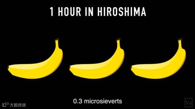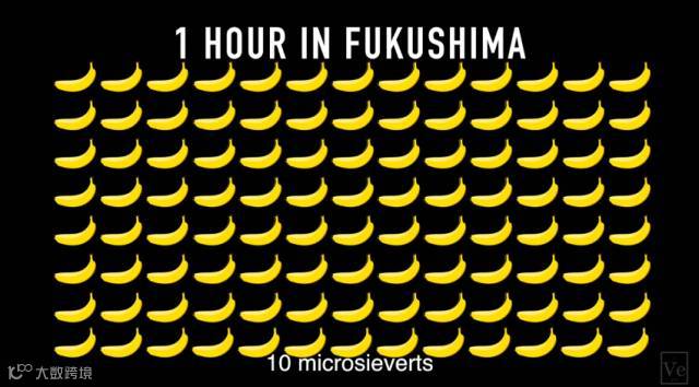但因为时间短,衰变少,因此,辐射量依然在 5~10 微西弗 / 小时左右,那么在福岛待一小时的辐射量,大约是——100 只香蕉 。
