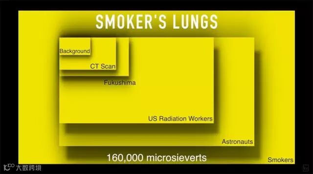 如果还是用香蕉来做比较,上图里面最小的框框是我们平均每人受到辐射本底数据,那烟民每年自内而外受到的辐射量就是最外的那个框框哦。