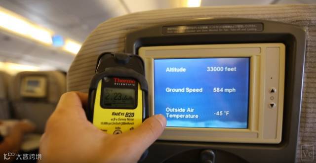 在飞机中,到 33 000 英尺的时候,辐射的强度大概是 2 微西弗 / 小时。当高度更高,更接近地球两极的时候,这种辐射的强度就更高了,最高可以达到 3 微西弗 / 小时。