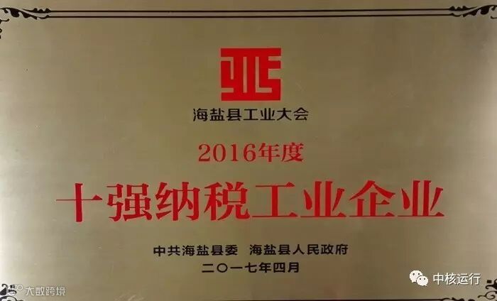 4月15日,在海盐县“415”工业大会上,公司被授予2016年度海盐县“十强”纳税工业企业称号。