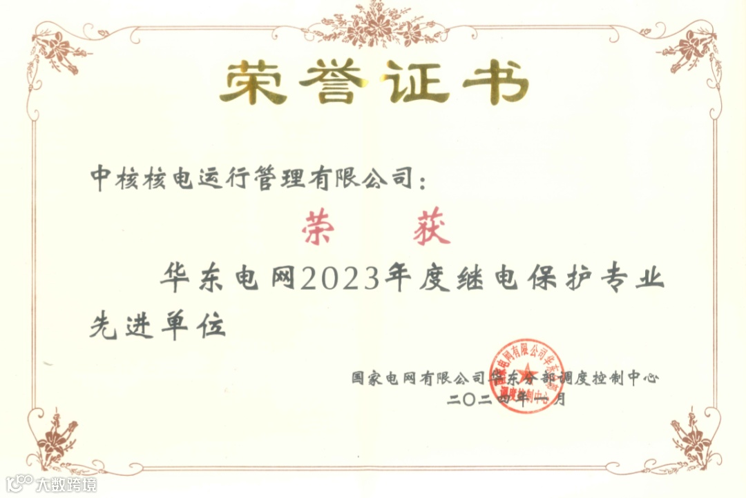 此外,秦山核电还荣获“华东电网2023年度继电保护专业先进单位”,刘怡君荣获“继电保护专业先进个人”。