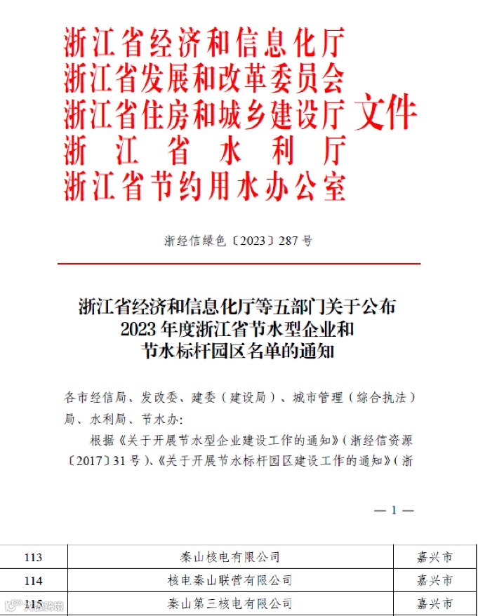 近日,浙江省经济和信息化厅联合五部门发布《浙江省经济和信息化厅等五部门关于公布2023年度浙江省节水型企业和节水标杆园区名单的通知》,秦山核电被授予“浙江省节水型企业”称号。
