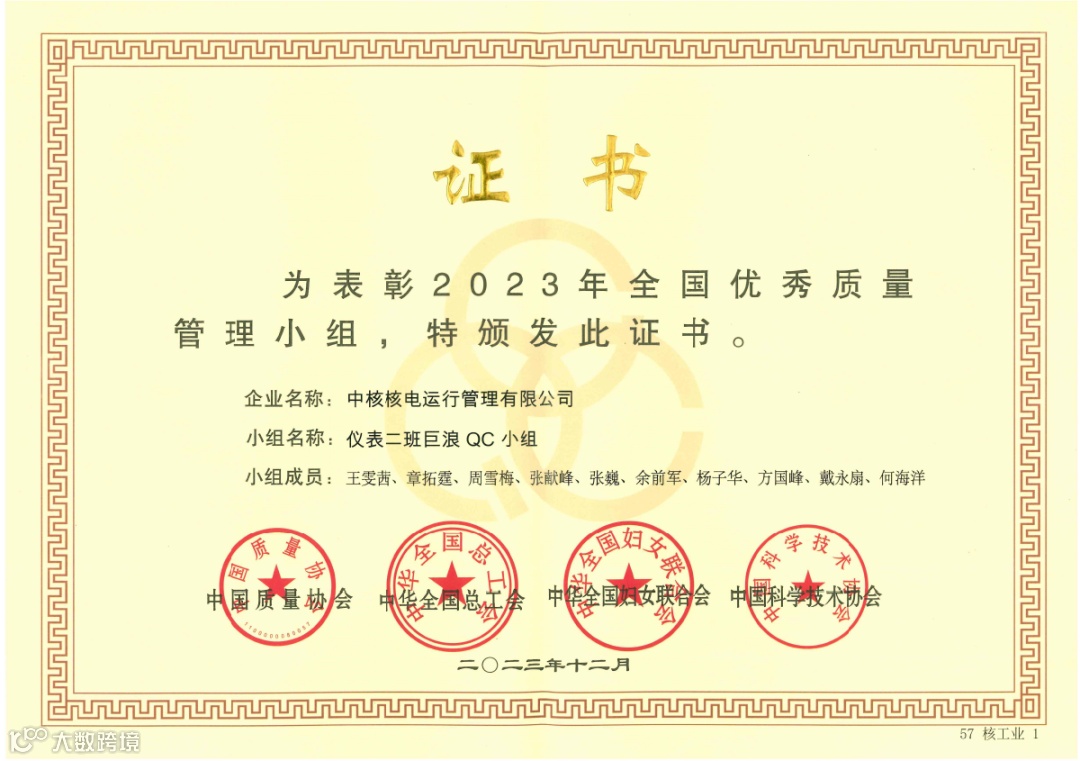 近日,2023年中国质量协会年会暨第二届全球追求卓越大会在京召开,秦山核电“仪表二班巨浪QC小组”荣获“2023年全国优秀质量管理小组”称号。