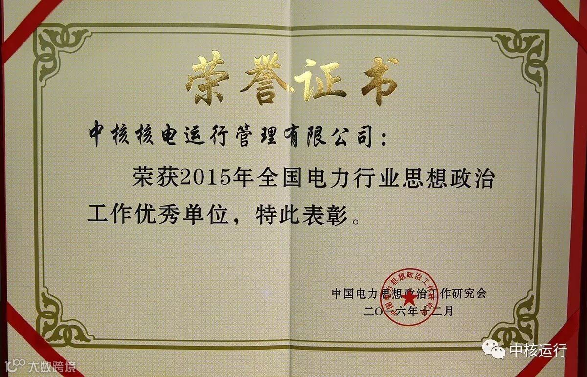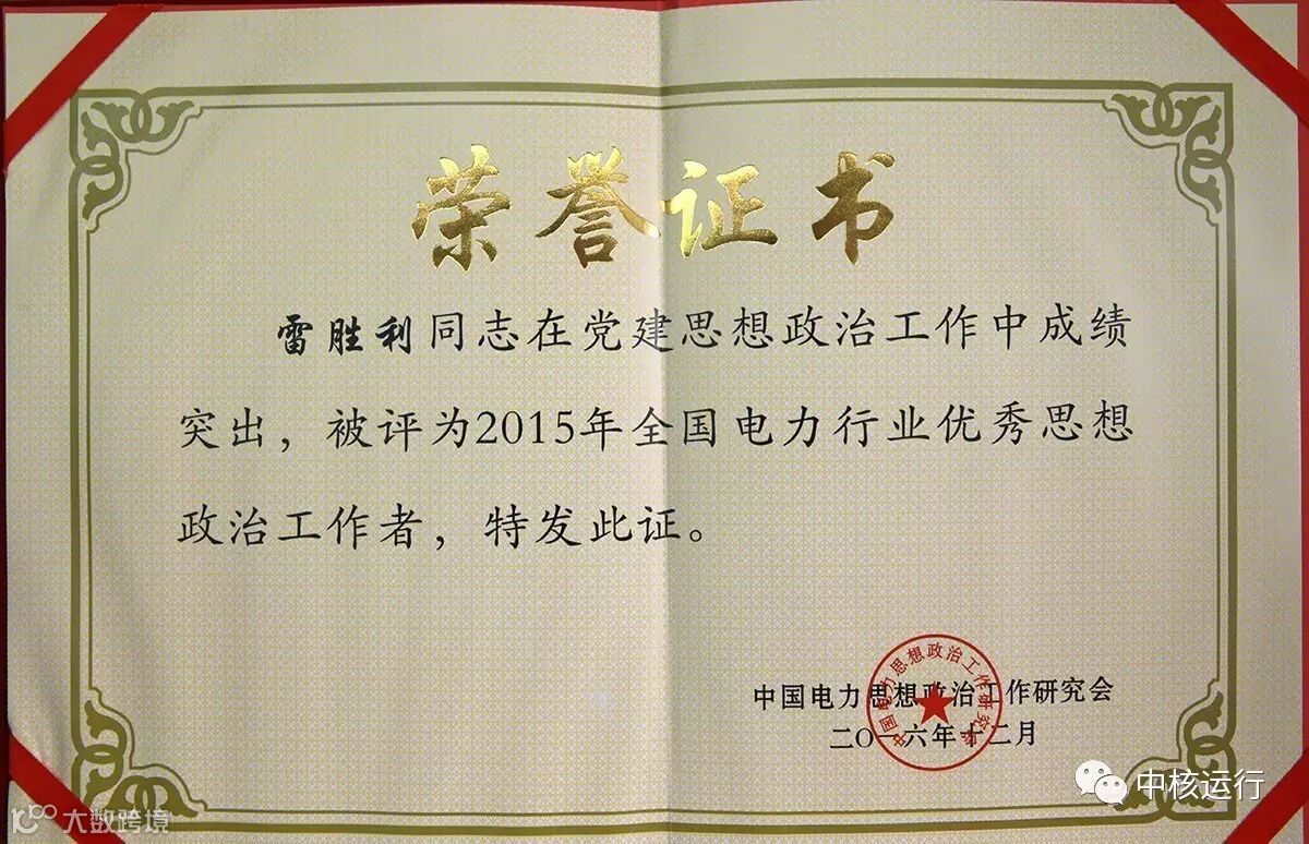 日前,从中国电力思想政治工作研究会获悉,中核核电运行管理有限公司获“全国电力行业思想政治工作优秀单位”称号,雷胜利同志获“全国电力行业思想政治优秀工作者”称号。