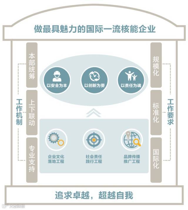 规划明确,中国核电企业文化建设要秉承卓越文化之道 ,要以强党建为引领,弘扬“四个一切”核工业精神,不断追求卓越、超越自我,以安全为本,以创新为要,以责任为魂,实施“企业文化落地、社会责任践行、品牌传播推广”三大工程,整合推进企业文化、社会责任及品牌传播工作;实现内强文化,增强团队凝聚力,打造公司核心竞争力;外塑形象,扩大对外影响力,提升公司品牌资产,全面融入公司“规模化、标准化、国际化”发展战略的实施过程,为企业创造价值,为股东创造利润,为员工创造幸福,为社会创造财富,引领实现“做最具魅力的国际一流核能企业”的愿景。