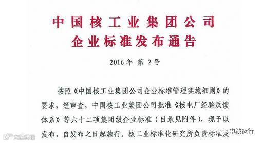 日前,中核集团发布了62项集团企业标准,秦山有5项标准名列其中。分别是:《运行核电厂化学品技术质量管理要求》、《压水堆核电厂现场辐射防护管理标准化流程》、《核电厂事故工况下应急补水接口标准化规范》、《核电厂流动加速腐蚀管理导则》、《核电厂阴极保护用牺牲阳极技术规范》。