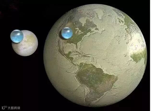 16. 左是木星卫星「木卫二」(Europa) 上头的水量,右则是地球上的水量。