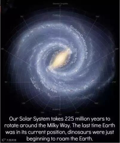 18. 我们的太阳系也是不断地移动,我们现在跟2.25亿年前的地球是在同一个位置,当时恐龙都还活着。
