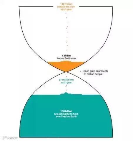 上图每一个点就是1000万人,每年有1.4亿人诞生,现在有70亿人口,每年有5700万个人死亡,估计曾有1080亿人在地球活过并死去。