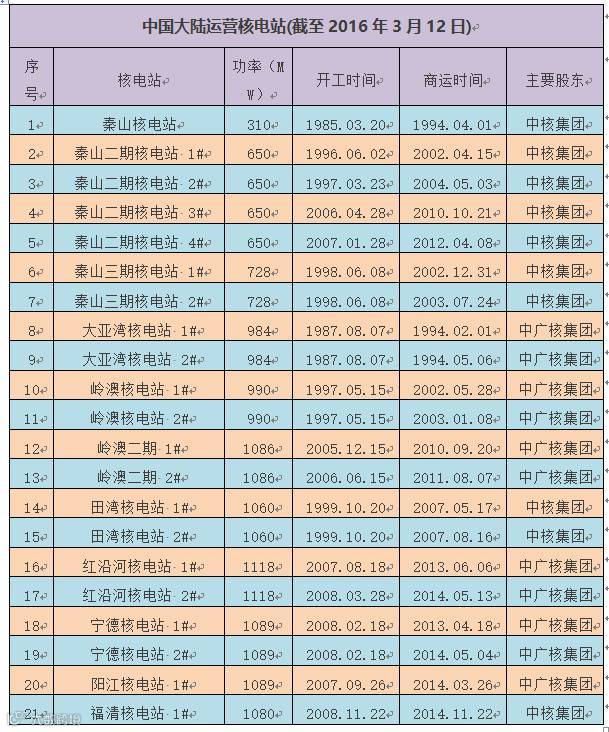 中国大陆已运营核电站(截至3月12日)