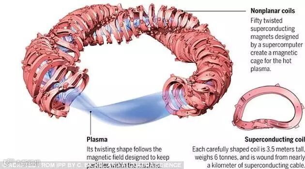 在托卡马克中,研究人员用两组磁铁来约束等离子体。一组为外部装置,围绕着真空室,另一组则是内部变压器,用于驱动等离子体中的电流流动。这样一 来,中心的磁场就会强于外部,因此托卡马克中的等离子体会朝着外壁移动,一旦撞上便会破裂。而在仿星器中,等离子体由外部磁线圈进行约束。这些磁线圈会在 真空室内部周围产生弯曲的磁场线,从而牢牢地控制住其中的等离子体,不让它们接触到容器四壁。