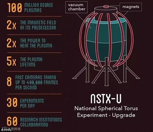美国能源部普林斯顿等离子体实验室(简称PPPL)的物理学家们近日在期刊《核聚变》(Nuclear Fusion)上发表了一篇论文,公布了他们研发新一代核聚变设备的计划。“我们希望能为未来的发电厂提供新的发电途径。”该研究的主要作者乔纳森·梅纳德说道。他同时也是PPPL实验室前不久刚刚完成的“国家球形托卡马克实验升级”(简称NSTX-U)项目的项目主管。此次升级耗资约9400万美元(约合6.27亿人民币),由美国能源部科学办公室出资赞助,于去年开始运作。