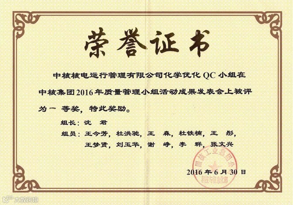 6月28日至30日,在中核集团2016年质量管理(QC)小组活动成果发表会上,公司推荐的3个活动成果取得了优异的成绩。其中来自化学处化学控制一科的《降低发电机转子冷却水铜含量》荣获一等奖,来自维修四处低压一班的《降低RX厂房环廊照明烧熔损坏率》和转机三班的《降低主空压机干燥器露点高故障率》荣获二等奖。