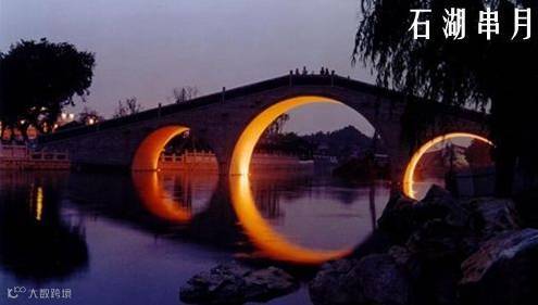 石湖,离苏州城西南九公里。石湖东面有座九环洞桥,又叫行春桥,这里是石湖看串月的最佳处。每当农历八月十七半夜子时,月亮偏西时,清澈的光辉透过了九个环洞,直照北面的水面上。这时,微波粼粼,在石湖水面上可以看到,一串月亮的影子在波心荡漾,这就是“石湖串月”奇景。这两三天中,石湖里灯船往来如梭、丝竹弦歌声彻夜不绝。上方山上,楞枷塔下,皓月当空,澄澈万里,湖波山岚,一片清光。