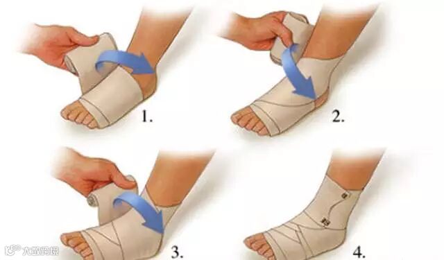 Compression(压迫),用弹性绷带包扎于受伤部位,减小受伤区域的肿胀,减少内部出血(以弹性绷带最大长度70%的紧度来包扎能获得充足的压力,注意观察露出脚趾或手指的顏色)