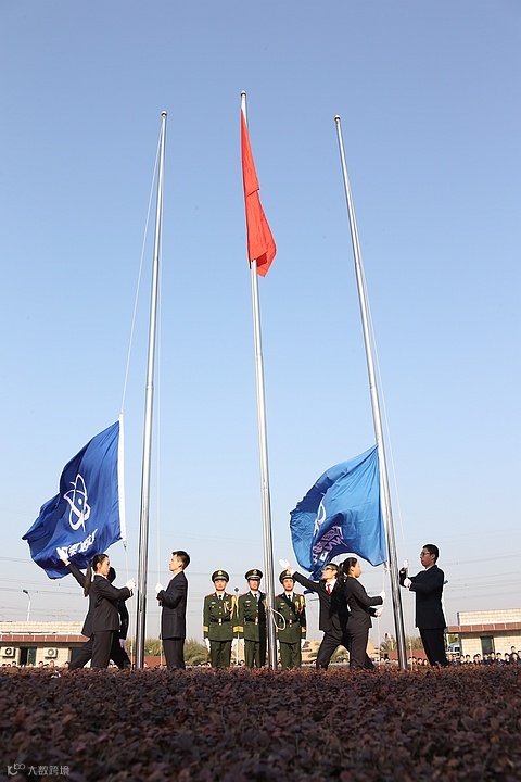 上午9时许,在雄壮嘹亮的国歌和《核工业之歌》歌声中,五星红旗和集团公司司旗冉冉升起,迎风飘扬。