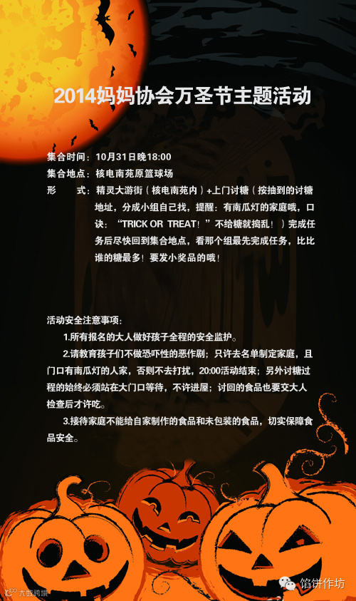 由中核运行妈妈协会举办的万圣节主题活动于今晚6点准时在核电南苑老篮球场集合,如遇下雨,请各位自备雨具,装扮好孩子,戴好万圣节道具,按时到现场按指定位置有序集合。万圣夜,风雨无阻,让我们来一场别具一格的雨中狂欢吧!