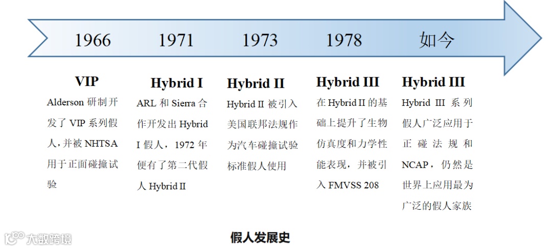 假人是根据人体工程学原理,用特殊材料制成的试验仪器,它可以替代人体用于汽车碰撞试验,从而模拟在交通事故中乘员受到的伤害情况,并且可重复使用。自1886年第一辆汽车诞生开始,汽车速度越来越快,导致了交通事故中大量的人员伤亡,于是提升车辆的安全性能迫在眉睫。起初韦恩州立大学的劳伦斯·帕特里克教授拿自己的身体做实验,再到动物做试验。直到1966年,第一代假人诞生,起初假人用于美国空军研究飞机弹射座椅,后来这些假人被广泛应用到汽车安全研究当中。