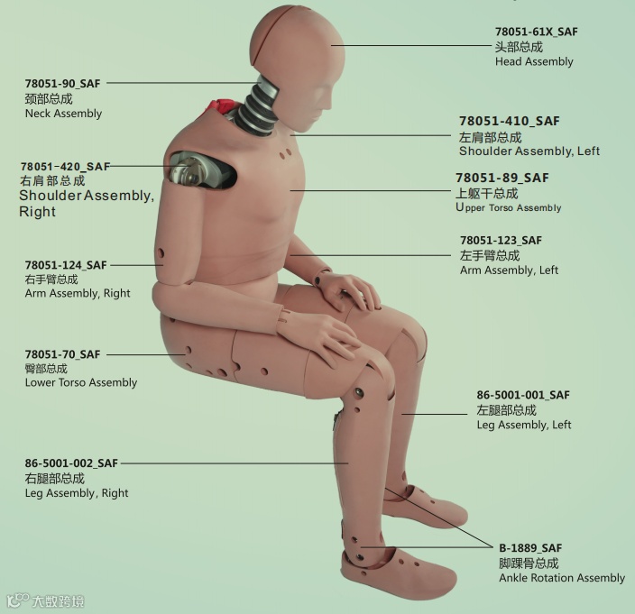 Hybrid III假人是基于欧美人体统计学参数设计和开发出来的,50百分位代表了人体统计学里的中等体型参数,其对应的身高和体重分别是177cm,77.7kg,具有类人化的形态和与人相似的生物力学响应。