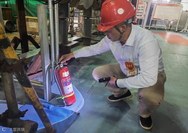 安全员王瑞章检查管道安装现场灭火器压力值