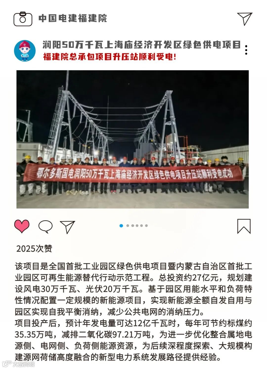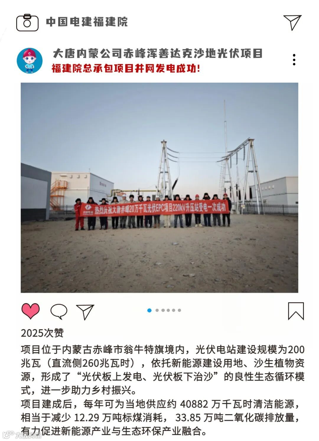 岁聿云暮,新元肇启。2025年,福建院以实字开头、干字为先,奋力跑好新年“接力棒”,一批新能源项目相继并网发电,为高质量发展构筑亮丽底色。跟随项目部朋友圈,查收“节”报喜讯!