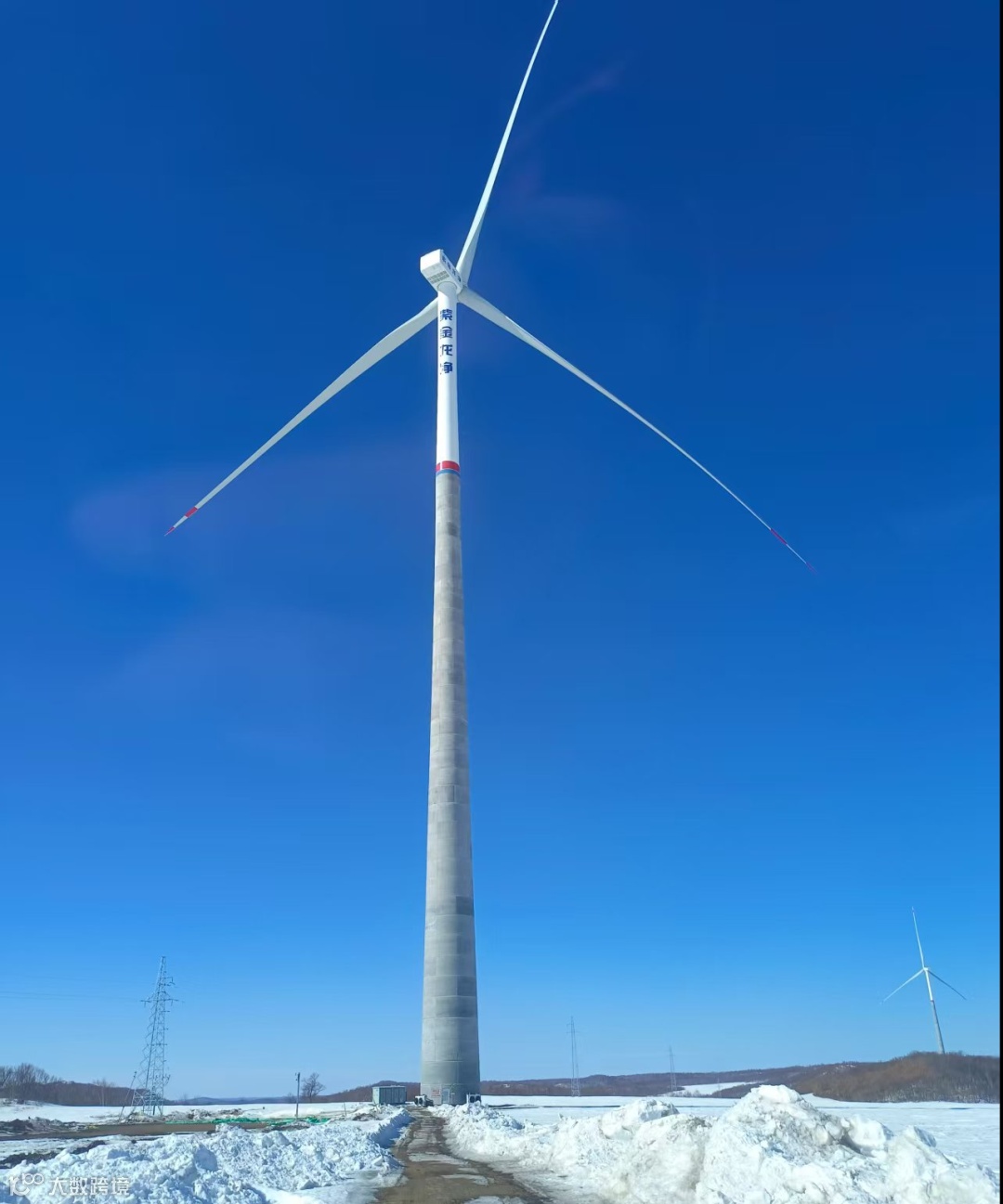 2025 年 3 月 31 日,首台风机叶片在高空平稳转动,标志着由我院EPC总承包的嫩江市多宝山生态矿山(冶炼)经济园区产消一体化100MW风电项目成功并网发电。该项目作为我院在风电领域于东北极寒地区开展的首个钢混预应力塔架结构大型风电项目,同时也是东北地区首个实现 “矿产资源开发 + 清洁能源供应 + 冶炼产业消纳” 全链条协同的产消一体化风电项目。