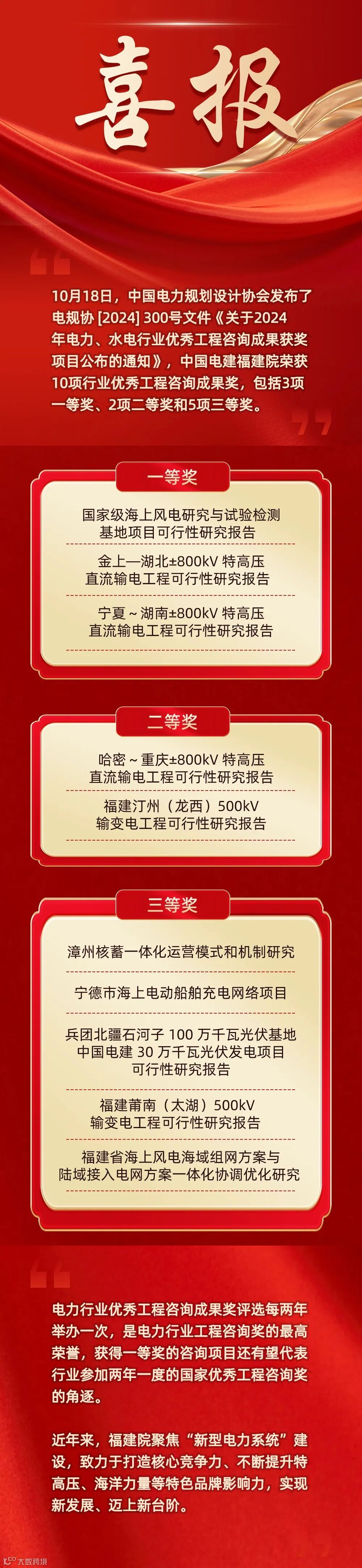 福建省电力勘测设计院是一家具备电力系统规划设计,各类大中型发电厂及不同电压等级输变电工程勘测设计、工程总承包综合甲级资质的国家大一型科技企业,是大型央企中国电力建设集团全资子公司。