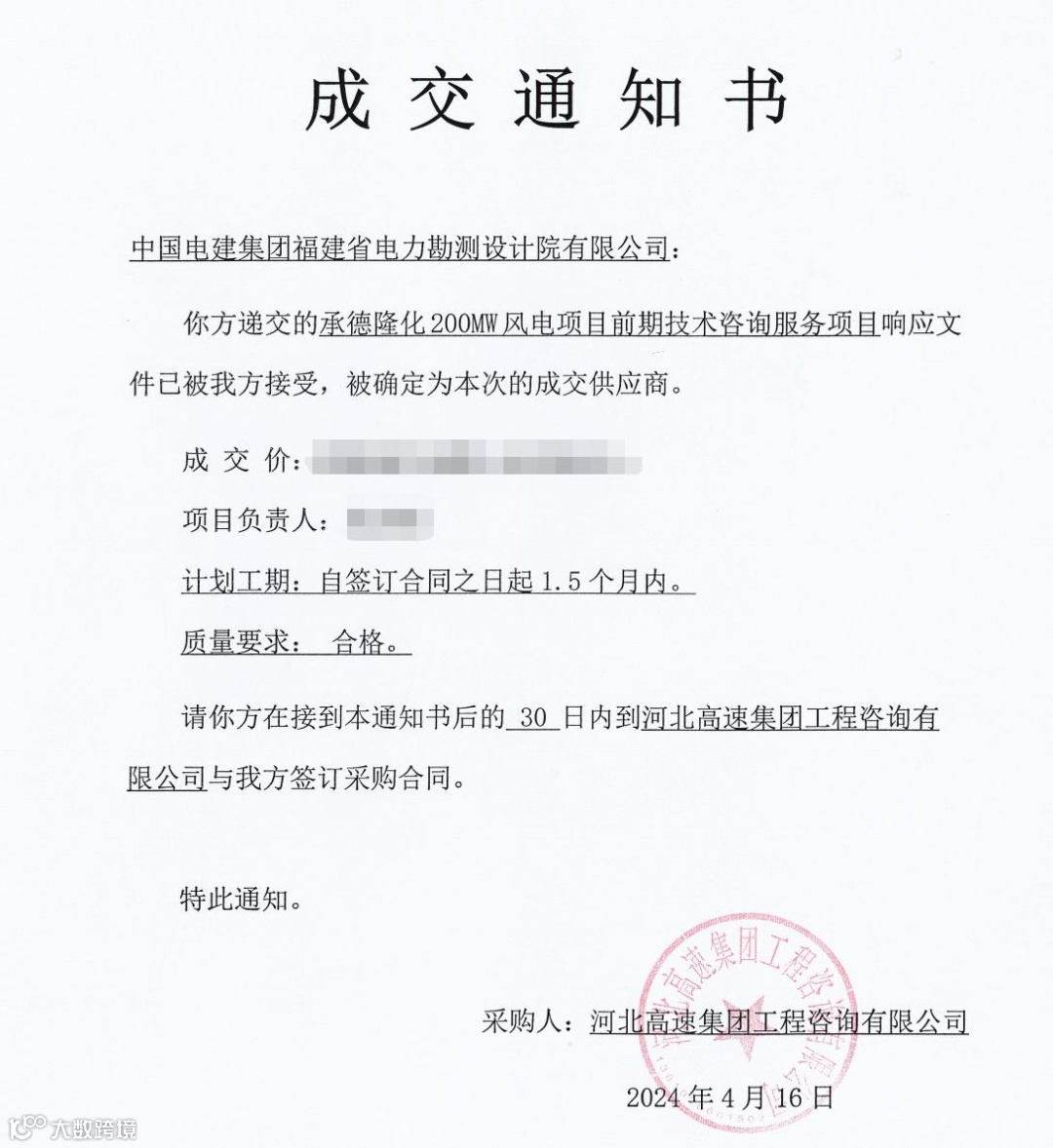 4月18日,公司收到了河北高速集团工程咨询有限公司发来的成交通知书,顺利中标承德隆化200MW风电项目前期技术咨询服务,此次中标为公司获取项目后续总承包合同打下了坚实的基础。